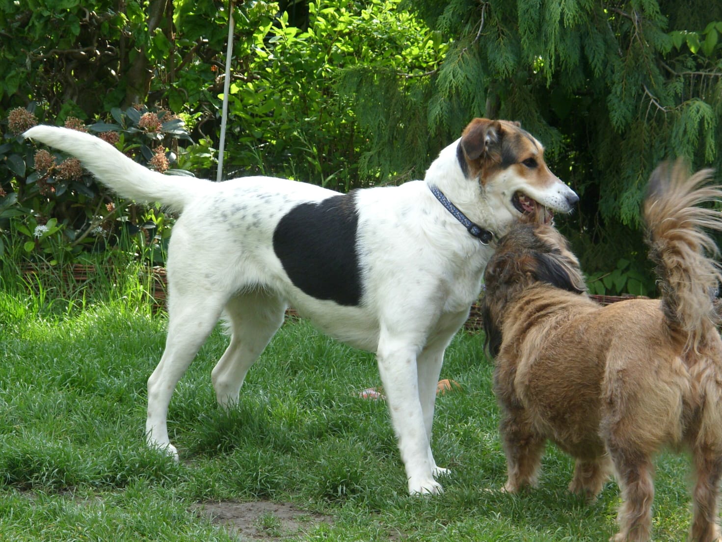 Mit anderen Hunden versteht sie sich gut, durch den Zaun würde sie gerne mit dem Nachbarshund spielen.