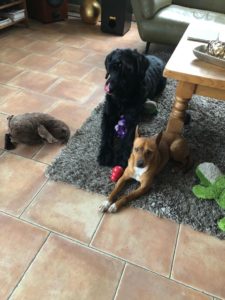 Grundgehorsam/Leinenführigkeit: an der Leinenführigkeit wird noch gearbeitet , Sitz ohne Ablenkung (im Haus) funktioniert schon ganz gut, draußen ist sie noch zu aufgeregt. Sie hört schon auf „nein“ und den Rest des Hunde-1×1 wird sie auch noch nach und nach lernen.